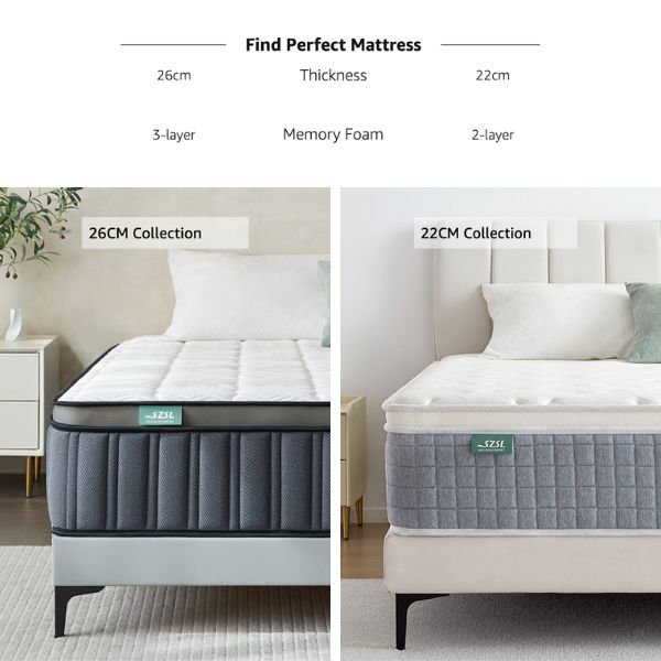 The SZSL Mattress is a medium-firm hybrid mattress combining memory foam and individually pocketed springs to provide balanced support and pressure relief. Its breathable knitted fabric cover ensures a cool and comfortable sleeping experience.